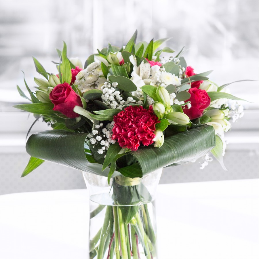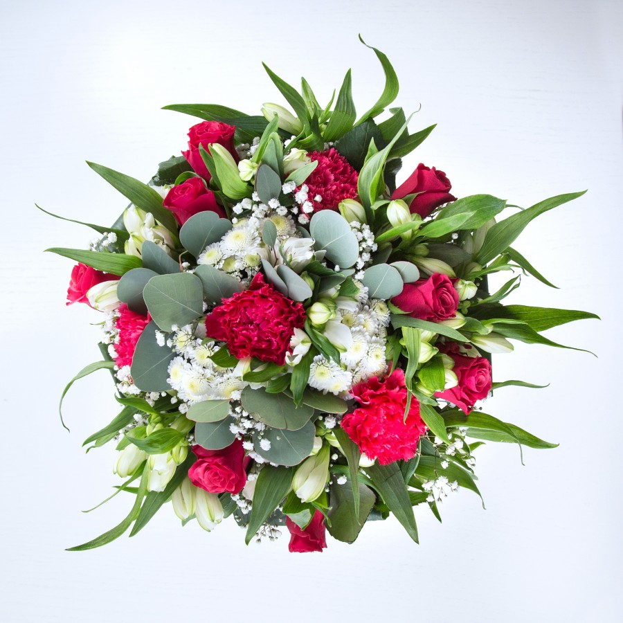 The Charming Harmony Bouquet offers a delightful mix of red roses, carnations, and white chrysanthemums, beautifully arranged with gypsophila, white alstroemeria, and aspidistra leaves. This arrangement is perfect for any occasion.